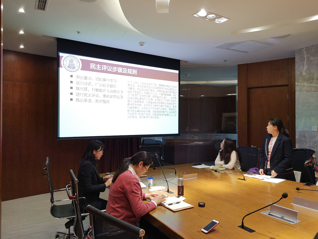 会议第二部分为组织生活会及民主评议会。支委先向全体党员汇报了支部2018年工作完成情况和不足之处,向全体党员反馈了此次党员谈心谈话的情况,支部也做出承诺,表示本年度将抓实整改,更好的服务党员,联系群众,促进党员之间交流,提高党课学习质量,丰富支部活动形式。之后,与会党员逐一开展自我评议,大家深刻诚恳,积极表态反思,表示愿意改正不足,争取在新的一年更好地提高和进步。会上,新转入党员苗琼月介绍了自己,同时即将转出的党员董佳也表达了自己依依惜别之情。接下来,通过民主评议匿名投票,章文娟、陈蓉蓉、倪佳琪、刘静、林燕等5名党员被评为优秀党员,其余党员均为合格党员。