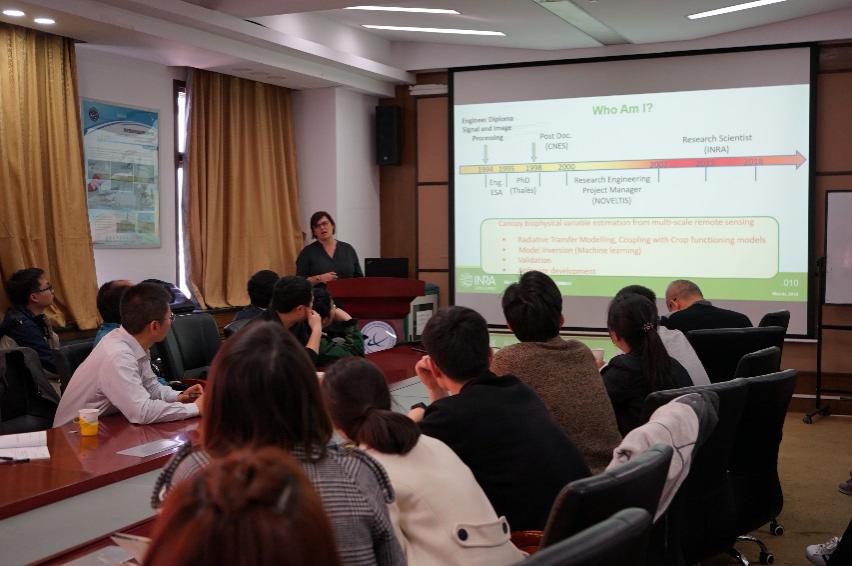 报告详细介绍了欧洲卫星遥感的发展、全球植被产品(LAI、FPAR等)的生产和地面观测网的组建等内容。作为法国农科院的资深科学家、RSE等顶尖遥感杂志的副主编,Marie向大家介绍了她的研究团队,并与在场的老师和同学进行了热烈的学术交流与讨论。