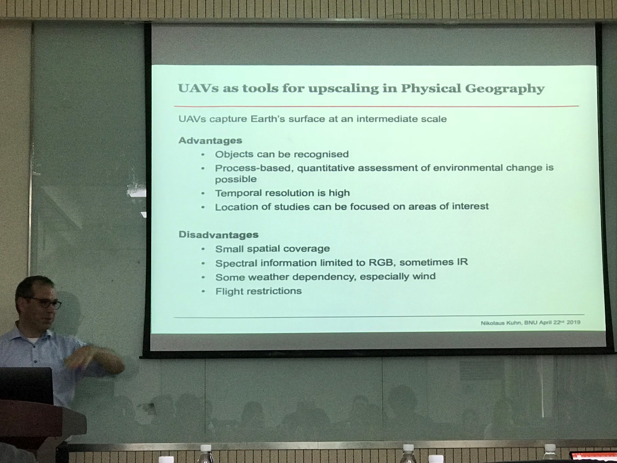 2019423日下午,由刘宝元教授主持的地理学前沿讲座第3期在生地楼148会议室举行。此次讲座邀请到了瑞士巴塞尔大学教授、瑞士地貌学会主席Nikolaus J. Kuhn教授与无人机飞行及图像处理专家Brigitte Kuhn女士,两位专家分别为到场师生作了题为“Unmanned Aerial Vehicles in Erosion Research at the University of Basel”与“Pix4d in Global Change Research: Two Case Studies from Switzerland and Southern Africa”的学术报告。