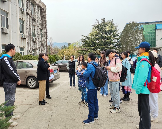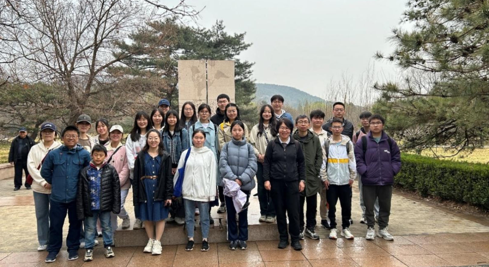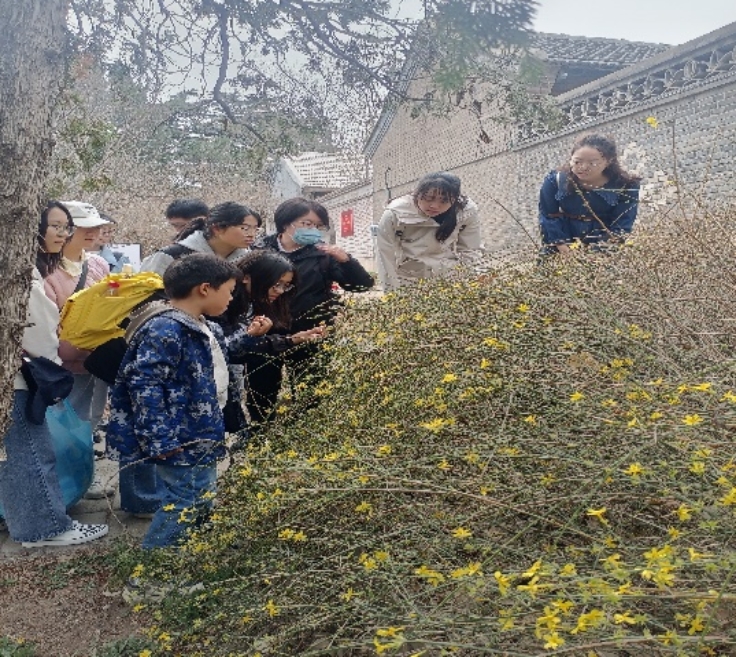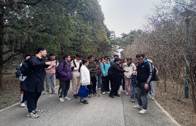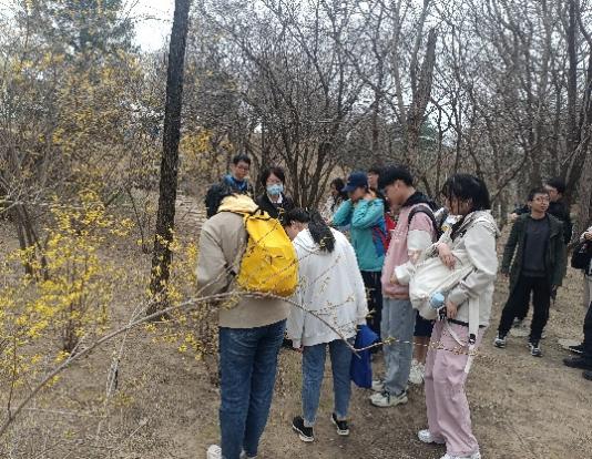 中午天空虽然下起了小雨,但是师生们用完餐后,依然兴致勃勃地参观了植物园北园。尽管气温有丝丝寒冷,但同学们都保持着高涨的热情。黄老师带领大家首先来到了曹雪芹纪念馆,随后向同学们介绍着路上看到的一些典型植物的特征与习性。黄老师告诉同学们如何从植物的花朵、果实和实物的形态特征去分类和辨识植物,例如如何辨别山桃树和杏树的树干形态差异,如何通过花瓣特征来区分迎春花和连翘等植物。在整个参观过程中,黄老师一直引导大家参观并解释园区内典型植物的特点,激发了同学们对植物的浓厚学习兴趣。最后,黄老师和王老师带领全体同学来到北纬40度地理标志处,大家一起合影。