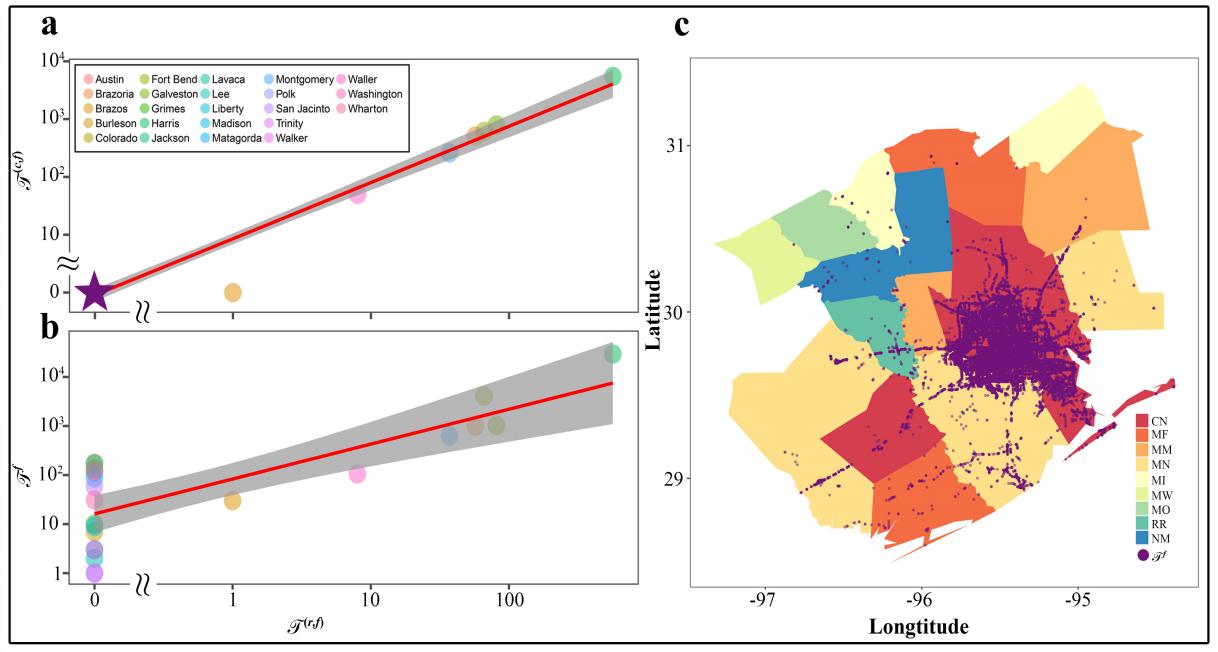 该论文提出了一套失效模型以定量评估洪水对公路网络的影响,并通过2017年哈维飓风事件对模型进行验证。研究通过收集整理2017年哈维飓风引起的洪水情景和失效公路路段数据,与失效模型计算出的失效路段进行了比较:模型计算出的失效路段可以有效地涵盖事件发生时交通部门关闭路段的90.6%,和被洪水淹没路段的94.1%(如图1所示)。
