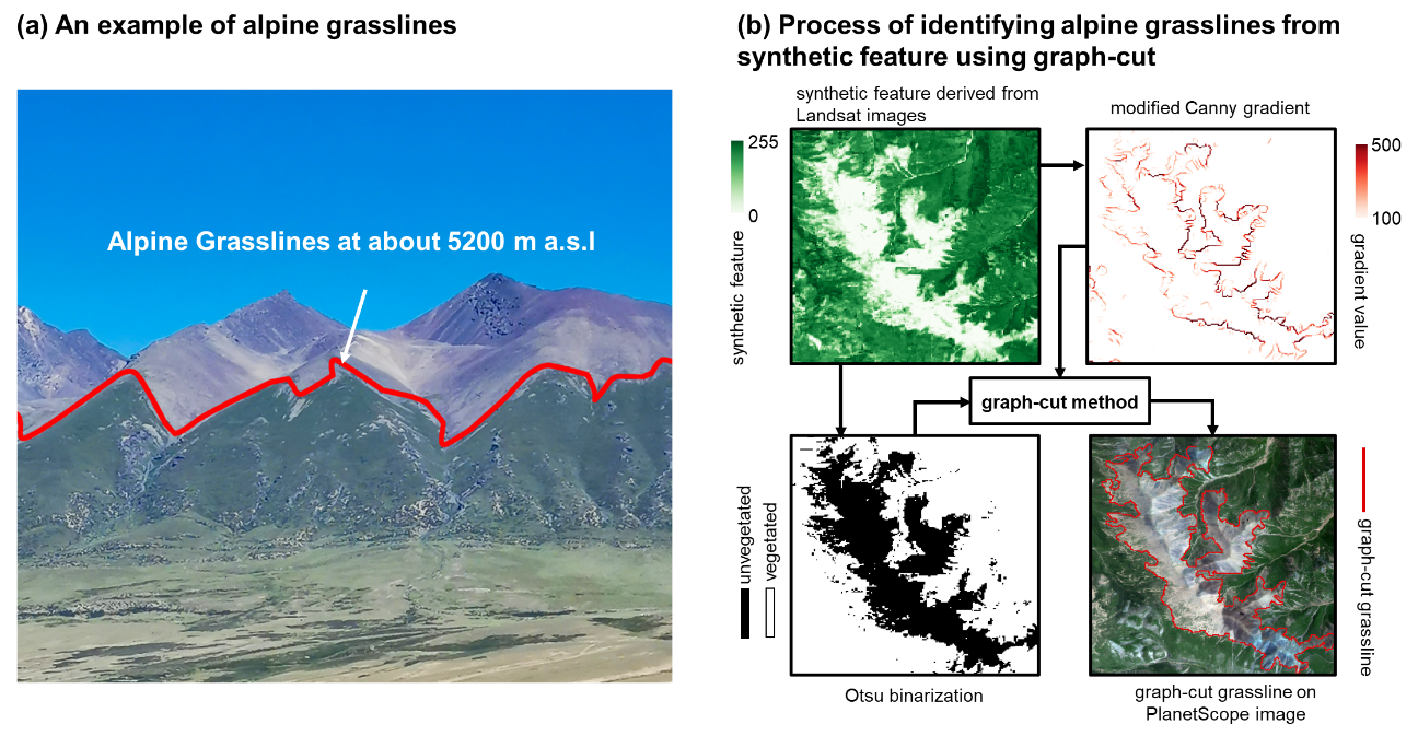图1,(a)高山草线示意。(b)用于识别高山草线的图割算法示意。