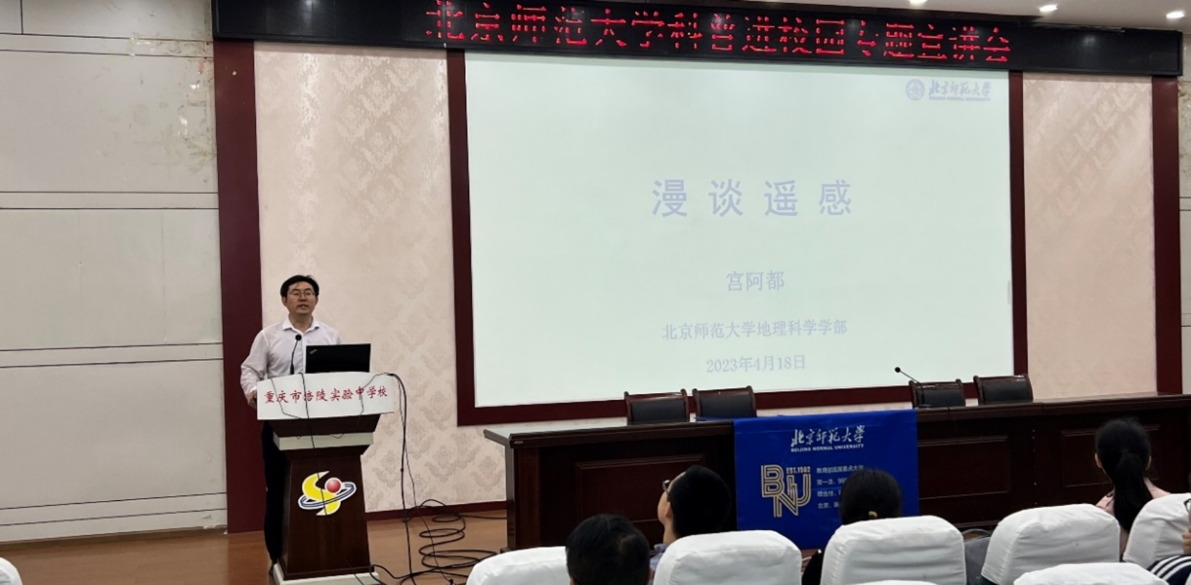 4月18日下午,苏筠书记、潘峰华副部长、宫阿都副教授、刘静老师走进重庆市涪陵实验中学校,与高川校长、许顶银书记、招生办张兴旺主任进行座谈并举行签约授牌仪式。高校长表示,非常欢迎琉璃神社 招生组以此种形式与涪陵实验中学建立联系,中学方会为北师大配备专门的招生宣传联络员,便于常态化招生宣传工作的开展。随后,宫阿都副教授面向高三年级部分学生及家长开展科普讲座——“漫谈遥感”,一张张生动形象的图片把学生吸引到了遥感的世界中,加深了学生对遥感科学领域的认知,也提升了国家遥感技术发展带来的民族自豪感。最后,潘峰华副部长开展高考招生宣讲,并与苏筠书记、刘静老师一道回答了学生的提问。
