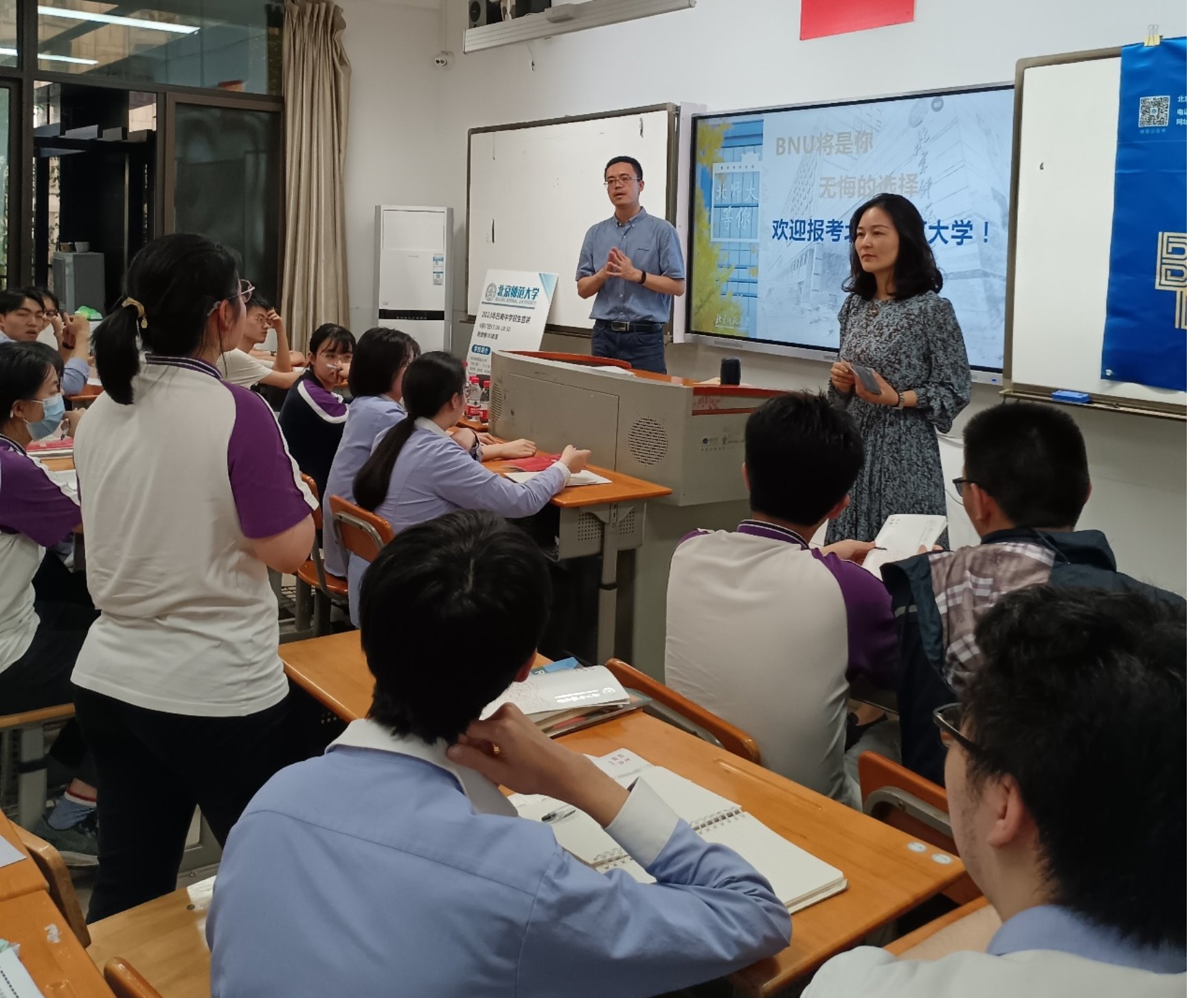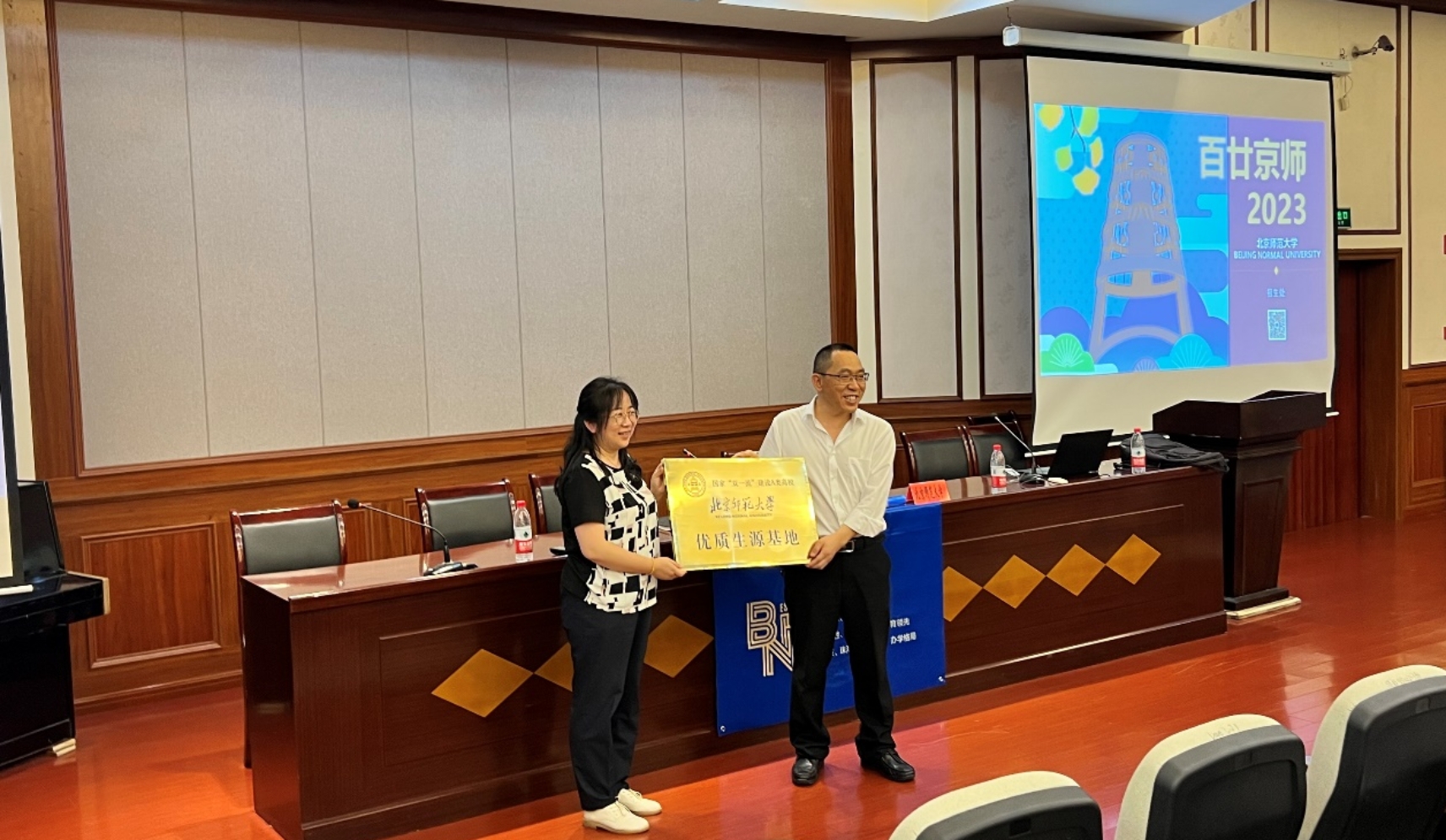 4月17日下午,潘峰华副部长、刘静老师回访优质生源基地重庆市巴蜀中学,得到了巴蜀中学副校长杜明元、宋晓宇,高三年级负责人龚南贵老师的热情接待。潘峰华副部长与杜校长就深化合作,互通共融进行了交流。随后,潘老师面向高三年级开展招生宣讲,百余名学生参加,现场气氛活跃,学生们对北师大表现出极大的兴趣,提问互动环节长达一个小时。