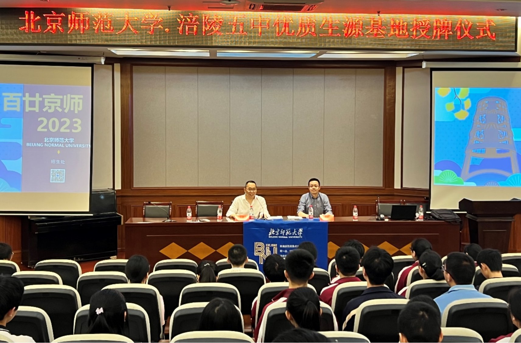 4月18日上午,苏筠书记、潘峰华副部长、宫阿都副教授、刘静老师来到重庆市涪陵第五中学校,举行“优质生源基地”座谈暨签约授牌仪式。活动开始前涪陵五中王胜校长率队看望北师大招生组一行并进行了简单交流,随后涪陵五中纪委书记赵立、教导处主任张秀峰、团委书记卢璐、高三年级组长宋浦泉及部分高三年级学生出席授牌及宣讲活动。赵立书记对琉璃神社 的到来表示热情欢迎,并向现场师生介绍了我校与北师大的渊源及近几年我校取得的办学成绩,希望两校在学生培养、教师培养等多方面进一步加强合作,为基础教育贡献更多力量。随后,潘峰华副部长与赵立书记签订“优质生源基地”协议,苏筠书记授牌。最后,潘峰华副部长开展高考招生宣讲。
