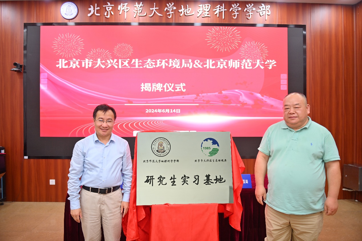 一行人首先来到了校史馆,参观了北师大百年辉煌历程与学术积淀。随后,在生地楼180会议室举行了“关于助力大兴区‘援兴育才’计划实施,推进生态环境保护与绿色高质量发展”合作框架协议签约仪式与“研究生实习基地”揭牌仪式,活动由董孝斌副部长主持。王坡局长和吴云峰常务副部长分别代表合作单位签署并交换了合作框架协议,赵景海副局长和周涛副部长共同为“研究生实习基地”揭牌。