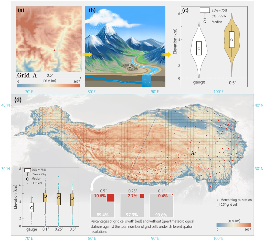 代表性误差指利用空间插值方法将代表性“点”数据推求至“面”降水量过程产生的误差,可进一步划分为网格代表性误差和区域代表性误差。青藏高原地形复杂,即便在一个网格单元内也存在显著的地形变化,垂直降水梯度明显。但是,气象站点通常位于山谷或低海拔地区(图2a),无法反映其所在网格单元的整体降水特征(图2b)。以高程为例,青藏高原现有气象站高程比相应网格单元(0.5°× 0.5°)的平均高程低约1 km(图2c)。而对于无地面测站分布的网格单元,降水量需利用更远的台站数据进行推算,进一步降低了网格插值降水的可靠性,从而在区域尺度上引入代表性误差。由于交通不便、监测环境困难,青藏高原现有的气象台站密度(每个站点平均覆盖22,000 km2)明显低于世界气象组织(WMO)推荐的最小站点密度。以0.1°× 0.1°网格分辨率为例,约只有0.4%的网格单元内气象站点分布(图2d)。此外,气象站点的空间和海拔分布不均进一步降低了区域降水的估算精度,区域代表性误差大幅增加。