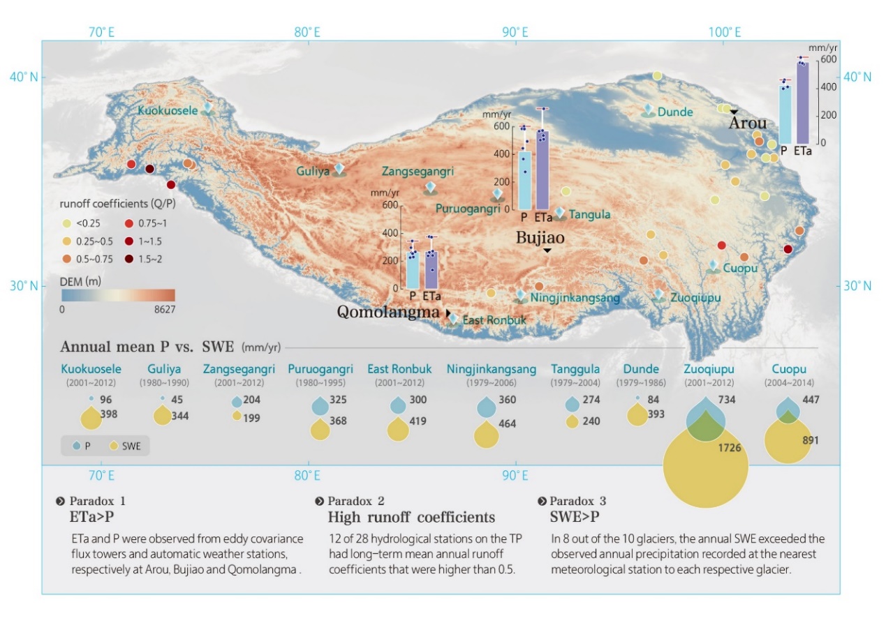 目前普遍认为,地面仪器监测(简称“器测”)是获取降水信息最主要、最可靠的手段。然而,本研究发现,器测严重低估了亚洲水塔的实际降水量(图1),具体表现为:1)实际蒸散发量大于器测降水量(Eta > P),2)河川径流系数普遍偏高,3)从多个冰芯中提取的雪水当量显著高于同期器测降水量(SWE > P)。