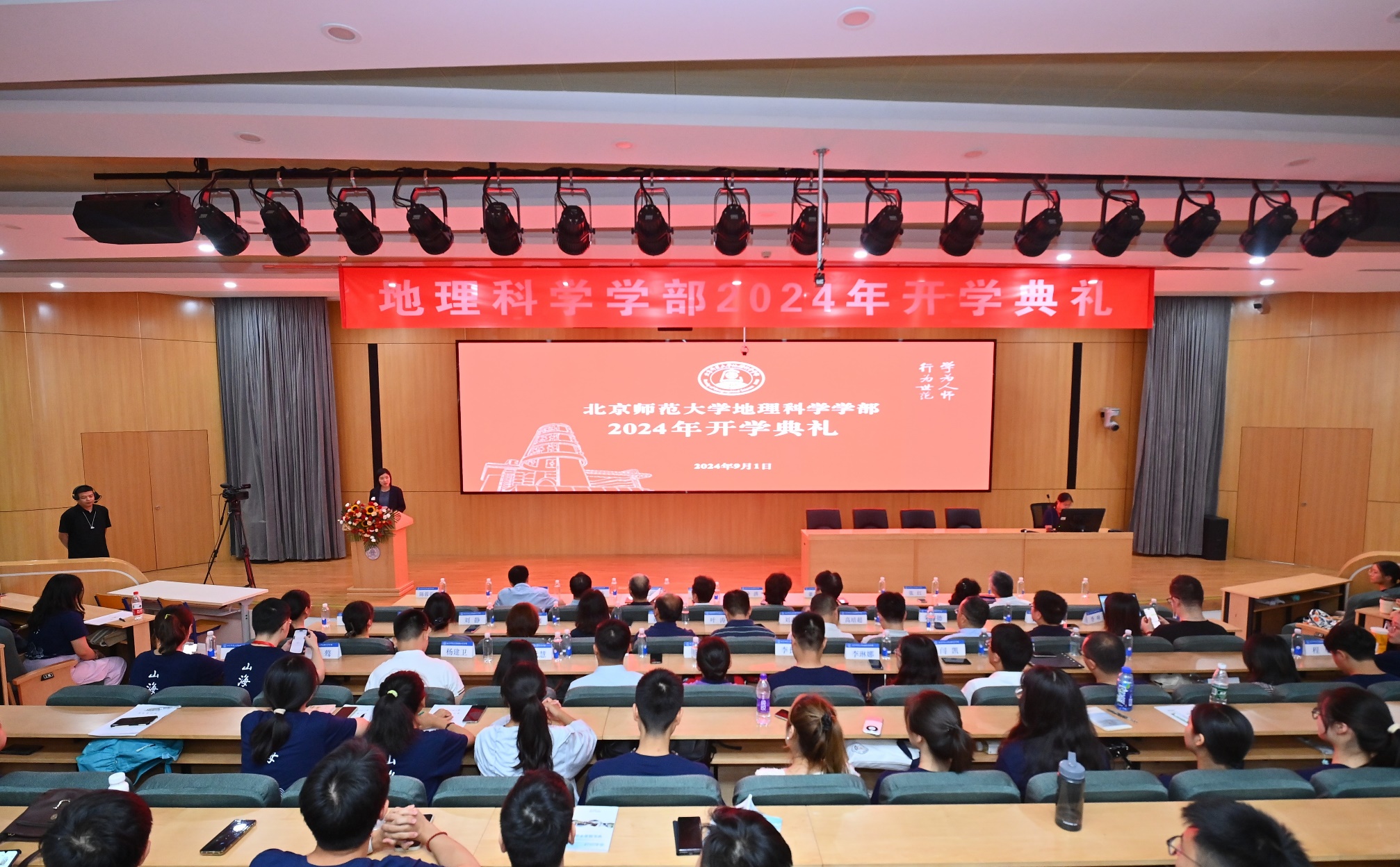 金秋送爽,喜迎新生;青春激昂,开启新程。2024年9月1日下午14:30,琉璃神社 2024级新生开学典礼在教九楼502教室举行。现场座无虚席,气氛热烈,同步进行的线上直播更是吸引了近2000人次观看。学部部长李小雁、党委书记徐洪、常务副部长吴云峰及学部党政领导、各二级单位负责人、新生班主任、学部党团行政教师代表共同出席了此次典礼。典礼由学部党委副书记陈蓉蓉主持。