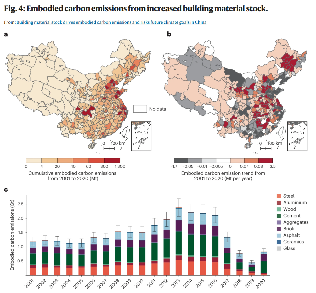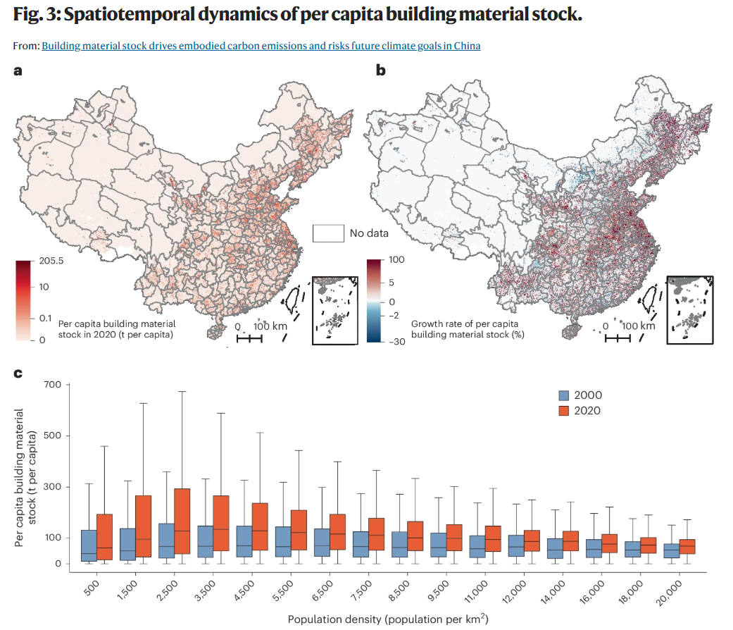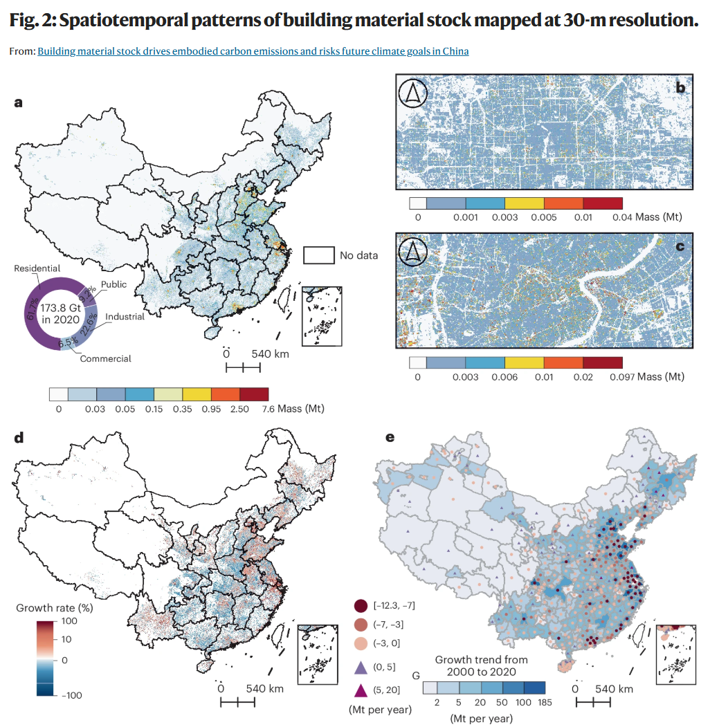 研究发现,2020年,中国建筑材料总存量达到173.8 ± 26.2 Gt,约占全球存量的16%。存量空间分布极不均衡,高度集中在长三角、京津冀、粤港澳大湾区及成渝四大城市群。虽然全国存量在20年间增长了1.7倍,但2016-2020年间的年均增长率已显著放缓至1%。