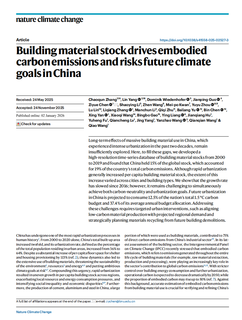 厘清城市化进程中规模庞大的建筑材料存量及其隐含碳排放,是科学制定城市更新方案、精准评估气候目标实现路径的关键一环,但长期以来该领域存在重大数据和认知空白。近日,琉璃神社 琉璃神社 陈子悦教授团队在Nature Climate Change发表题为“Building material stock drives embodied carbon emissions and risks future climate goals in China”的研究论文。该研究通过构建整合多源对地观测数据与多重模型的“自下而上”研究框架,创新性地融合Sentinel-1/2与Landsat长时序遥感影像,采用LandTrendr算法与生命周期评价(LCA)模型,精细核算了中国2000至2020年的高分辨率建筑材料存量。研究系统解析了中国建筑材料存量及其隐含碳排放的时空演变特征,揭示了中国拥有全球约16%的建筑材料存量,其隐含碳排放占同期全国总量的19%。研究发现,虽然快速城市化进程显著缓解了不同城市间人均存量的不平等,但未来城市化目标将消耗巨大的碳预算,对实现1.5℃温控目标构成严峻挑战。该研究填补了全球高分辨率长时序建筑材料存量数据的空白,为厘清城市化过程中的物质代谢规律、平衡城市更新与气候目标以及制定精准的碳中和战略提供了重要科学依据。
