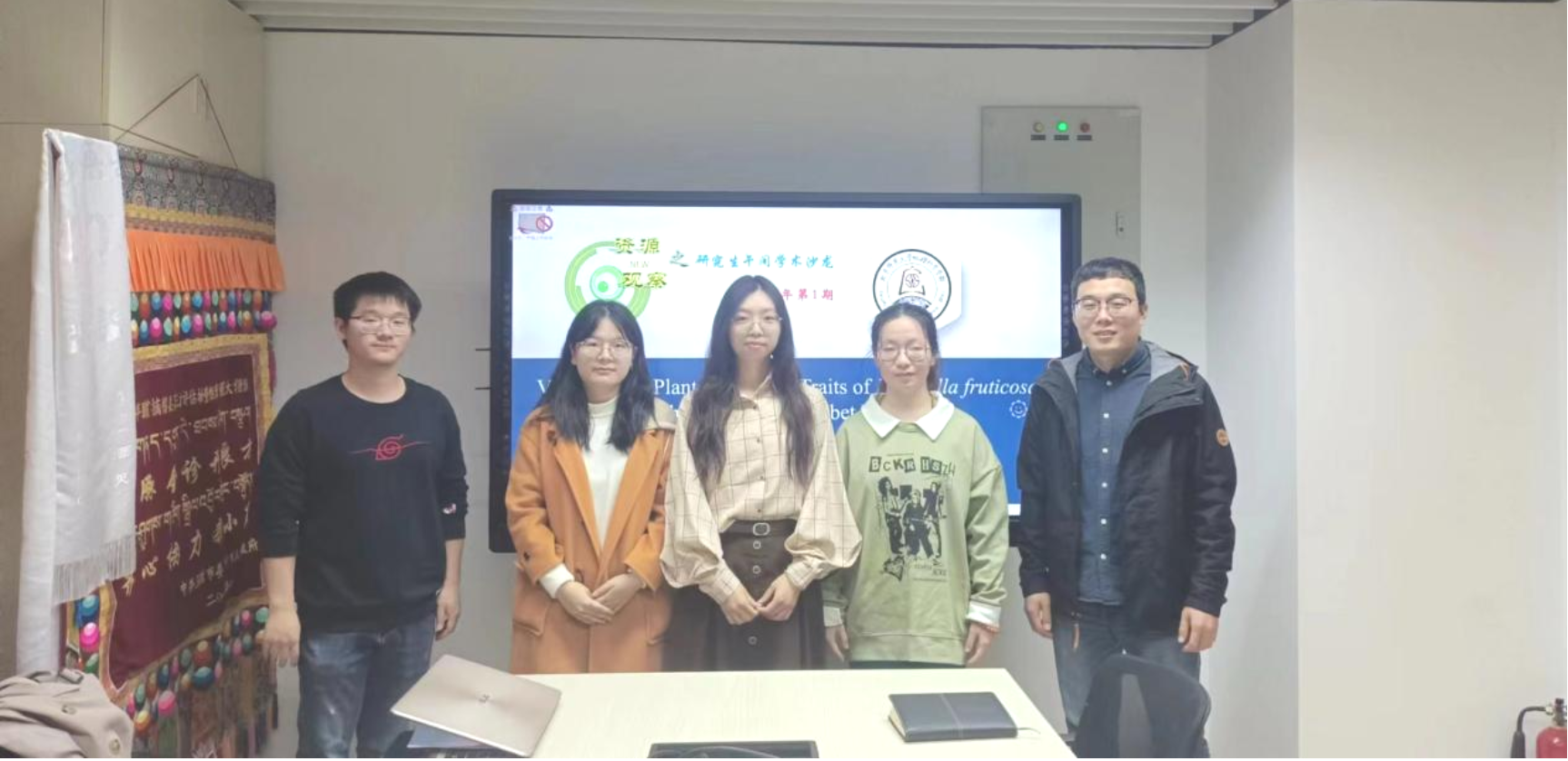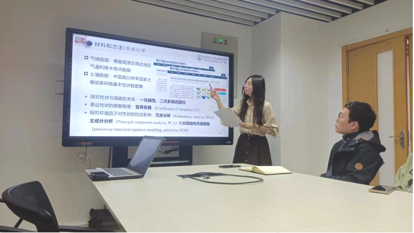 刘一瑶同学的汇报聚焦于青藏高原金露梅的研究,旨在探究环境因子对金露梅性状的影响。研究结果显示,气候和土壤条件对金露梅功能性状的变异贡献较大,降水和土壤养分对植物功能性状的影响最显著。她还综合分析了金露梅多种性状对环境的响应,为预测全球变化下金露梅分布范围等生态学变化提供了有力的依据,也为高寒区植被保护提供了重要参考。刘一瑶同学结束汇报后,同学们进行了深入讨论。