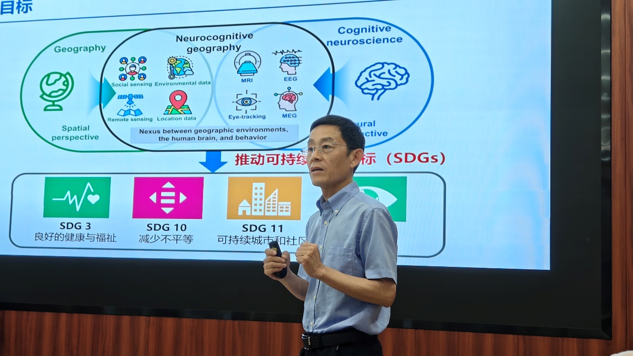 董卫华教授作题为“认知神经地理学”的学术报告。首先,董卫华教授介绍了认知神经地理学这一交叉性研究领域的研究背景、概念和目标,随后提出城市化对大脑与行为的多尺度塑造、自然环境对人类大脑与行为的长期塑造、灾害对人类大脑与行为的影响、跨文化群体交流的认知神经机制四个科学研究问题,并介绍了现有的研究成果。接着,董卫华教授阐述了数据采集、数据安全与伦理以及数据整合分析的研究框架,分享了认知神经地理学领域目前在数据获取方面面临的问题,以及数据使用需要遵守的原则。最后,董卫华教授提出了认知神经地理学未来面临的时空尺度效应、环境-大脑-行为复杂反馈机制、跨学科合作等多方面的挑战和机遇。