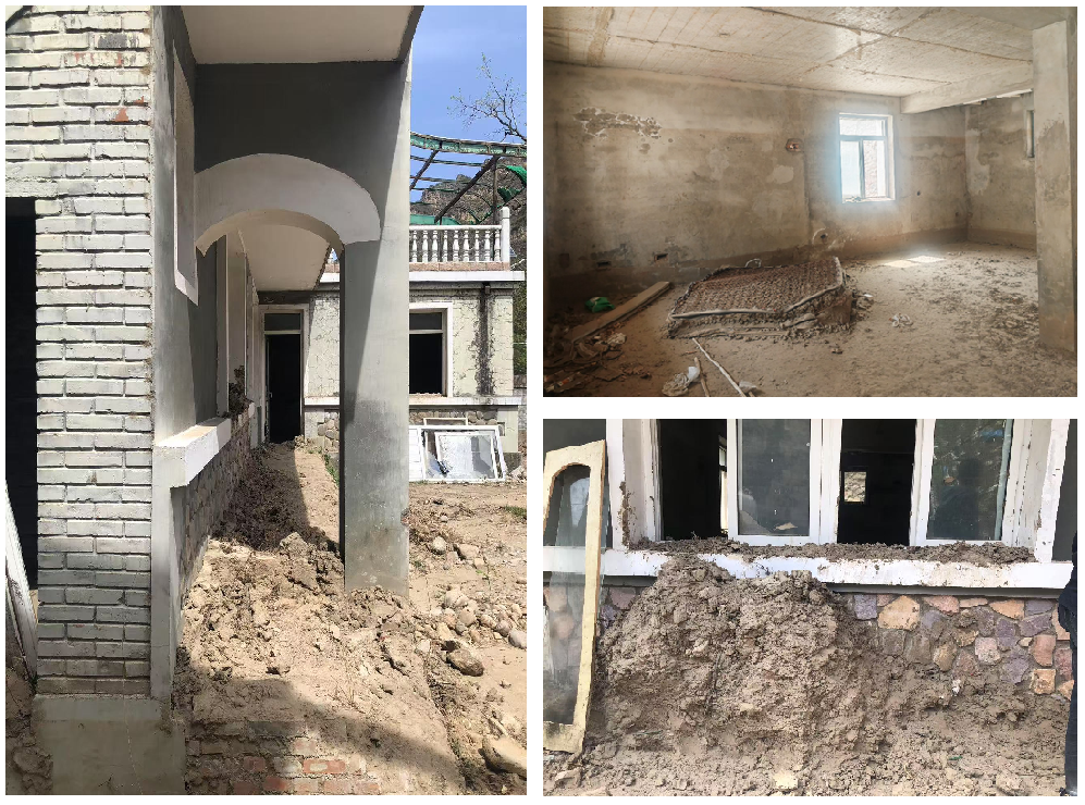 随后,团队集体前往后石门村,重点研究了石门及上游的洪水楔沉积特征与分布范围。通过实地观测,教师们分析了石门对洪水水位的调控作用,并探讨了洪水沉积物在区域内的分布规律。在后石门村村口,团队考察了一组在2023年洪灾中损毁严重的房屋,结合现场痕迹推断历史洪水数据,探讨了极端气候事件对聚落安全的影响及防灾减灾措施。