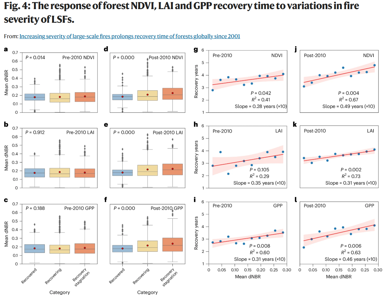 研究进一步详细阐明了LSFs对植被结构和功能的破坏程度及其恢复过程差异(图2)。LSFs导致森林植被指数(NDVI)、叶面积指数(LAI)和总初级生产力(GPP)显著下降,平均降幅分别为19.5%、34.1%和23.2%。并揭示2010年后LSFs导致的森林恢复难度显著增加,具体表现为:完全恢复比例降低、平均恢复时间延长(平均减少2.3%)、恢复停滞现象增多(平均增加3.0%),更重要的是首次揭示了恢复时间对火灾严重程度的正向敏感性显著增强的现象(图3和4)。火灾严重程度加剧不仅延长了恢复周期,亦增加了恢复停滞现象的发生频率,此现象在北方森林尤为突出。这可能预示着区域性森林衰退的风险,进而对全球碳循环及生态系统服务功能构成潜在威胁。