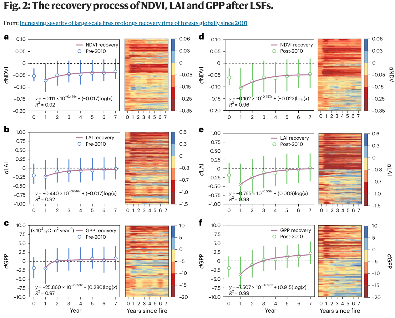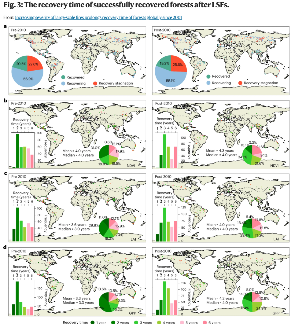 森林在全球生态系统服务、碳循环及气候变化调节中具有关键作用。然而,在人类活动与气候变化的影响下,全球森林火灾,特别是破坏性更强的极端大规模火灾(LFs),其频率与强度呈显著增加趋势,对森林结构与功能产生显著影响。LFs 不仅直接导致大量碳排放,其与全球变暖及干旱的耦合效应增加了火后森林恢复的难度,进而导致恢复期内累积碳汇损失(该损失可能超过火灾直接排放量),并可能引发森林退化,尤其对未来潜在的高碳汇区域(如北方森林)构成威胁,增加其由碳汇转变为碳源的风险。然而在全球尺度上系统性探究 LFs 后自然森林恢复时间的研究尚存空白。鉴于火灾排放在全球碳循环中的作用日益凸显,亟需探究 2010 年前后火灾特征(尤其是严重性)与气候条件的变化,及其对全球森林火后恢复过程的共同影响机制。深入理解 LFs 后的森林恢复机制及其关键驱动因素,对于准确评估森林碳汇潜力、制定有效的火后森林管理与干预策略、以及维持生态系统服务的可持续性具有重要意义。然而,目前尚缺乏全球尺度上关于LFs对森林恢复时间影响的系统性研究。