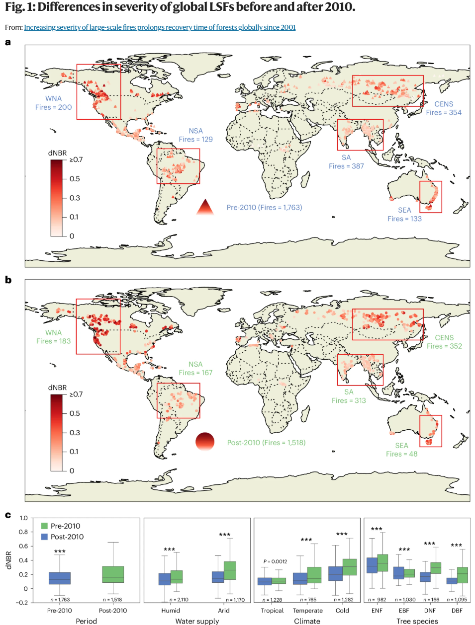研究首次系统证实2010年后全球大尺度森林火灾严重程度显著增强(图1)。基于差异归一化燃烧指数(dNBR)的分析表明,与2010年前相比,2010年后的LSFs严重程度呈现显著增加(P < 0.001),此现象在北美西部(WNA)、西伯利亚中东部北部(CENS)及澳大利亚东南部(SEA)等热点区域尤为突出。该增长趋势在湿润地区(中位数dNBR增加14.4%)与干旱地区(增加42.9%)均达到显著水平。从气候区来看,严重程度增幅自热带至寒带逐渐加大,寒带地区增幅达54.3%。所有森林类型均受到影响,其中常绿针叶林(ENF)受损最为严重;常绿阔叶林(EBF)、落叶针叶林(DNF)和落叶阔叶林(DBF)的中位数dNBR亦分别显著增加了15.7%、48.2%和42.4%(P < 0.001)。