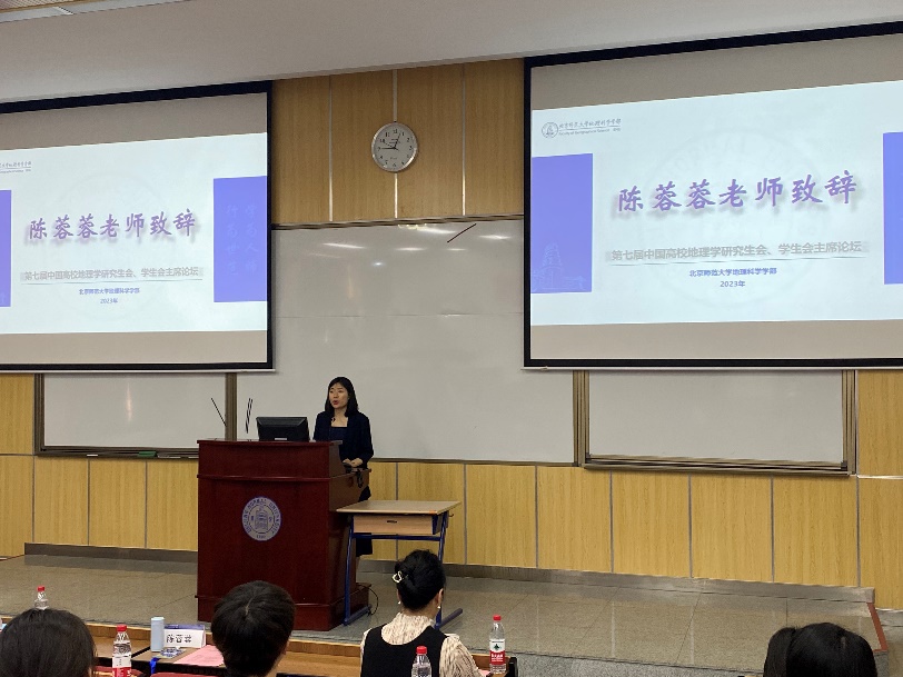 论坛开始,学部党委副书记陈蓉蓉老师致辞。陈老师用“初心”“挑战”“坚持”三个关键词肯定了青年地理人秉承初心、勇于挑战、砥砺前行的精神,并期许学生干部能够铭记传统、推陈出新、笃行不殆,更好地发挥团结青年、服务青年的榜样带头作用。校研究生会主席团成员白鸽同学在致辞中希望各高校形成跨地域的长期工作交流机制,彰显时代特色、凸显学科内涵、满足时代需求、实现学科引领,为推动地理学发展做出贡献。