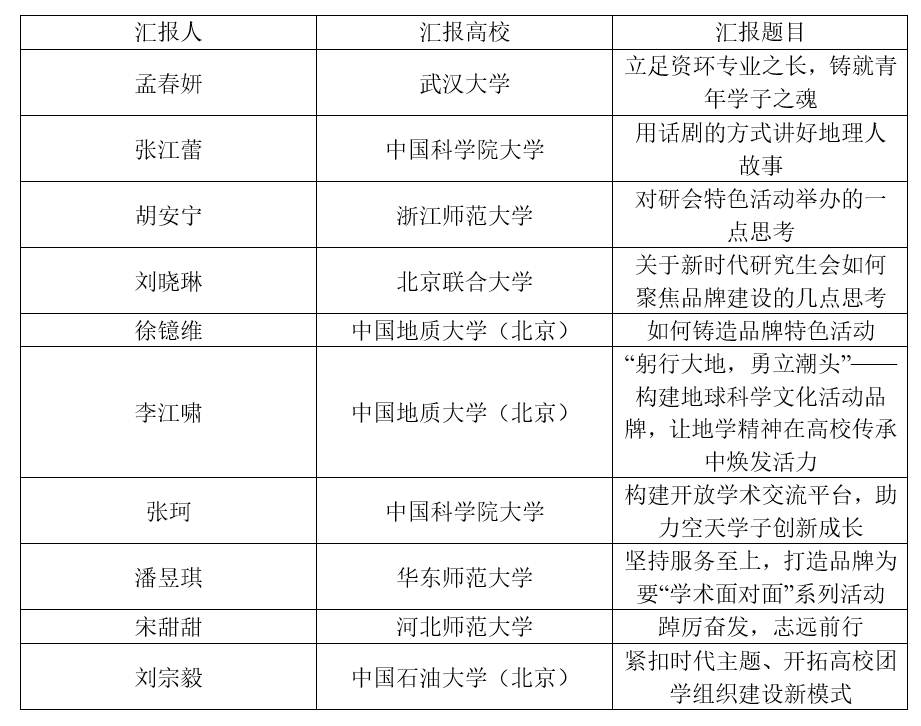 下午,十所高校本研学生会学生干部依次进行汇报交流。各高校学生代表立足各学校特色和工作重点,分别就学生组织深化改革落实成效、学生活动如何凸显地理学特色、学生活动如何助力学科发展、地理学助力中华民族伟大复兴·等四个汇报主题展开了充分交流与讨论。