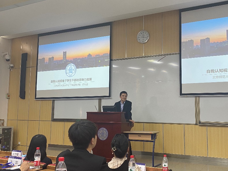 嘉宾致辞后,许志星老师为参会师生作题为“自我认知视角下学生干部的领导力发展”的主题讲座。许老师以心理学的角度切入,阐述了领导力的概念、高校学生干部的作用、新时代“00后”高校学生干部的特点、培养途径等方面进行了阐述。许老师建议学生干部加强自我认知,明确自身定位;提高自我激励,培养积极主动的态度;强化自我约束,遵守规则和原则;促进自我发展,不断学习和创新。