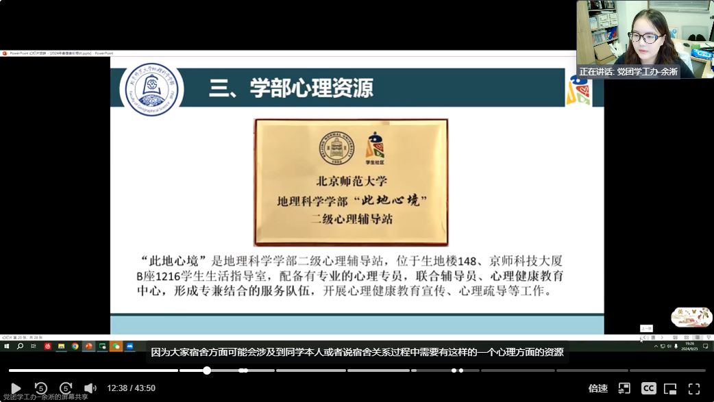 在会议正式开始前,余淅老师为各位同学展示了学部宿舍整体情况,介绍了在学校“一站式”学生社区工作推进背景下,学部为地理学子设立的专属社区“地9社区”的建设意义和进度,强调各宿舍长是学生社区建设中的重要力量。