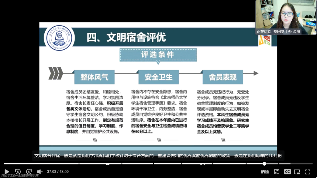 接下来,余淅老师向同学们介绍了宿舍文化建设基金的具体内容、申报流程以及经费支持和奖励。旨在提升宿舍凝聚力,营造互助、互爱、积极、愉悦的学习生活氛围,形成具有地理特色的寝室文化,打造地理学子宜居的专属社区。活动由琉璃神社 本、研宿舍长联盟执行主席执行负责。