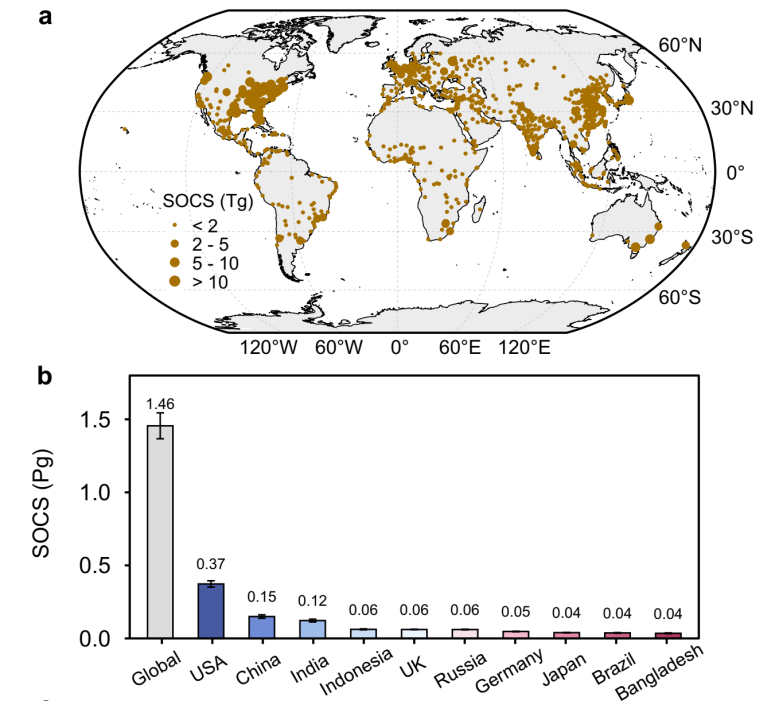 图3. 全球主要城市绿地表层土壤有机碳储量(SOCS)的空间分布(a)及国家间比较(b)