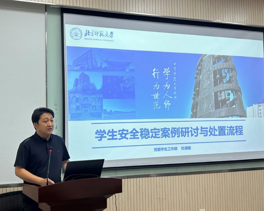 会议第一部分,由校党委学生工作部管理处(党委武装部)副处长杜德健老师进行安全稳定工作培训。杜老师从实际案例出发,向班主任老师们分享了多种突发或潜在的安全稳定工作案例及相应的处理原则和措施,并耐心解答了现场班主任老师关于处理本班案例的问题。