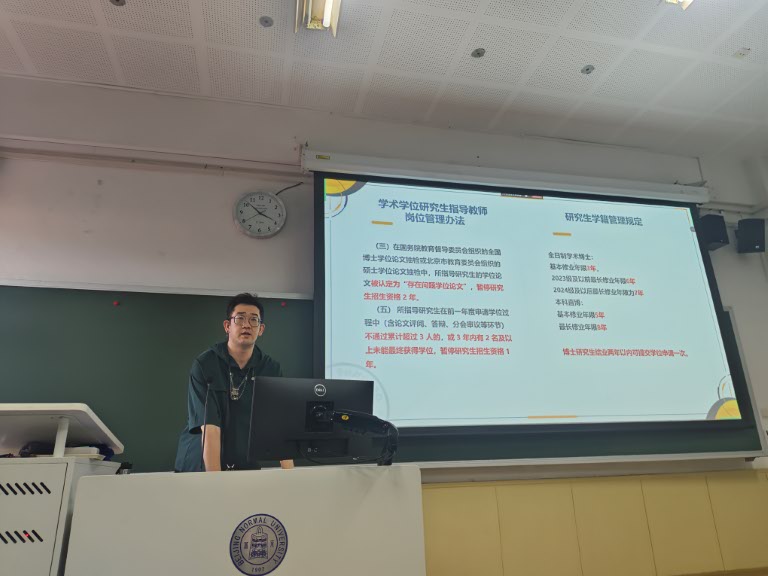 接下来,李响老师通过详细解析学校和学部针对研究生管理办法、研究生指导教师岗位管理办法、博士学位论文评阅工作实施办法等文件的更新与补充,对当前学校和学部的博士研究生培养方案进行了解读。李老师还介绍了博士学位的不同批次和主要时间节点,并重点强调了论文送审结果的重要性,提醒大家务必努力做好前期工作。李老师简要说明了后续答辩和毕业论文提交的相关事宜。