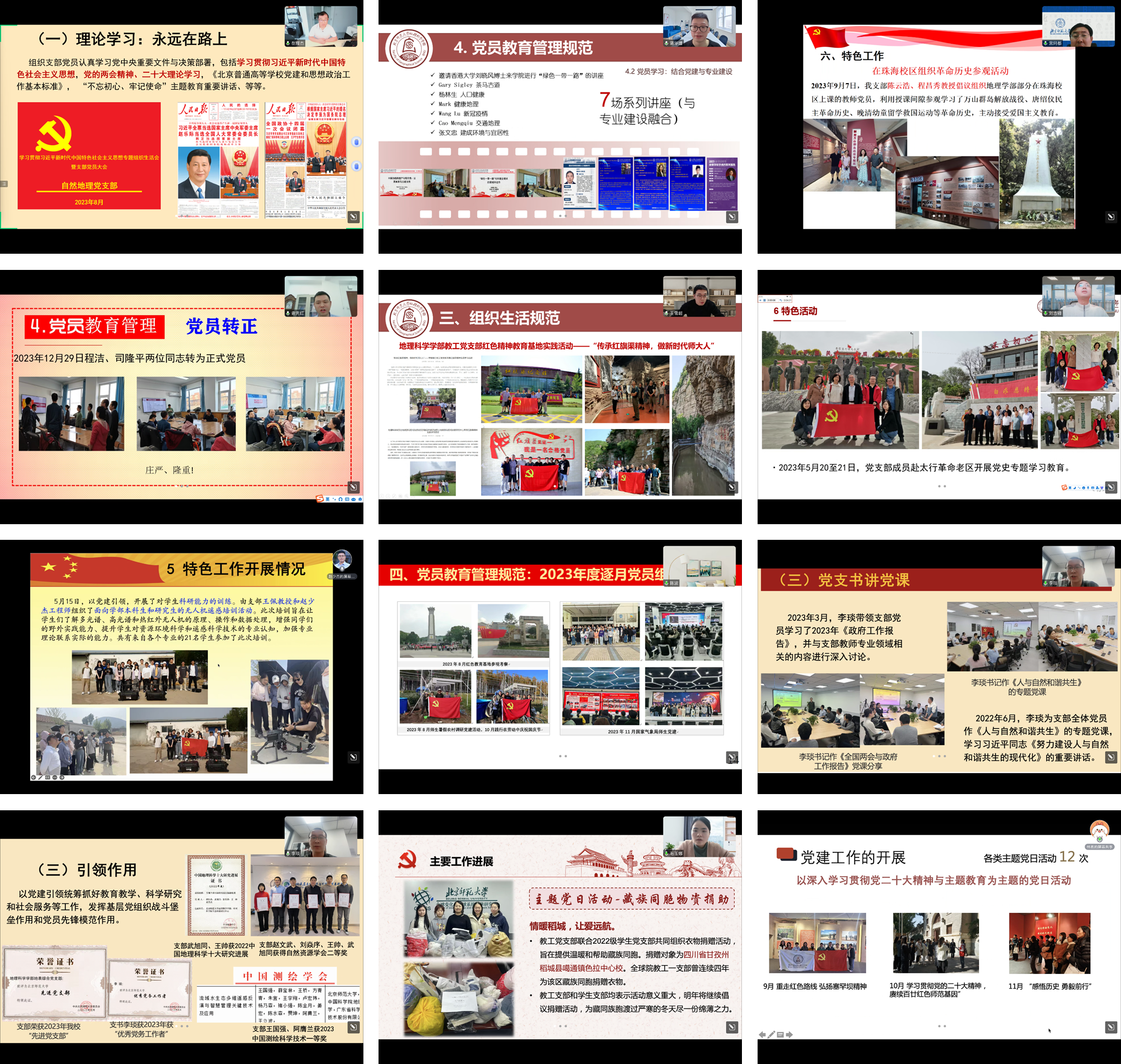 学部共有11个在职教工党支部,各支部分别围绕重点任务完成情况、支部设置规范、组织生活规范、党员教育管理规范、特色工作开展情况共5大方面、23个观测点进行了述职汇报。在2023年度,各支部规范落实“三会一课”要求,定期上报组织生活月报;按照学部党委对理论学时要求,通过党支部书记培训、二级党校课程、支部党课、学习强国APP等方式积极开展理论学习;全年分阶段围绕主题教育、我校第十四次党代会精神、习总书记关于教育的重要论述、师德师风建设、党的二十大精神等主题开展形式多样的支部专题活动,做到了思政和实践教育全覆盖、常态化;在人员聘用、晋职晋级、评奖评优等工作中严把政治关和师德关,充分发挥了党支部政治功能和组织功能;立足“双一流”学科建设和课程思政建设等提升教育教学质量,促进业务发展,整体呈现出创新、多样的党建活动新面貌。