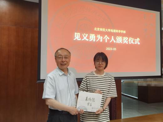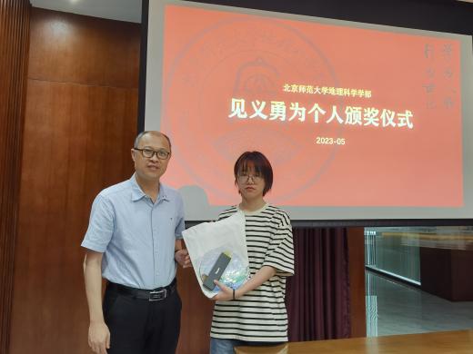 随后,宋长青部长为陈颖萍同学颁发了表扬信和奖金,吴云峰副部长为其颁发了学部纪念品。