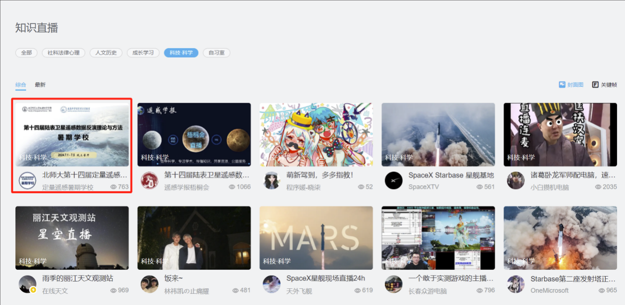 本课程通过哔哩哔哩(B站)、蔻享学术和遥感学报微信视频号三个直播平台同步全网直播,受到全球各相关领域的学者、学生及技术人员的广泛关注,取得了巨大的反响和良好的评价。三个平台累计直播累计81759人次在线观看学习,B站在“学习直播-科技科学”专区综合排序位于前列。