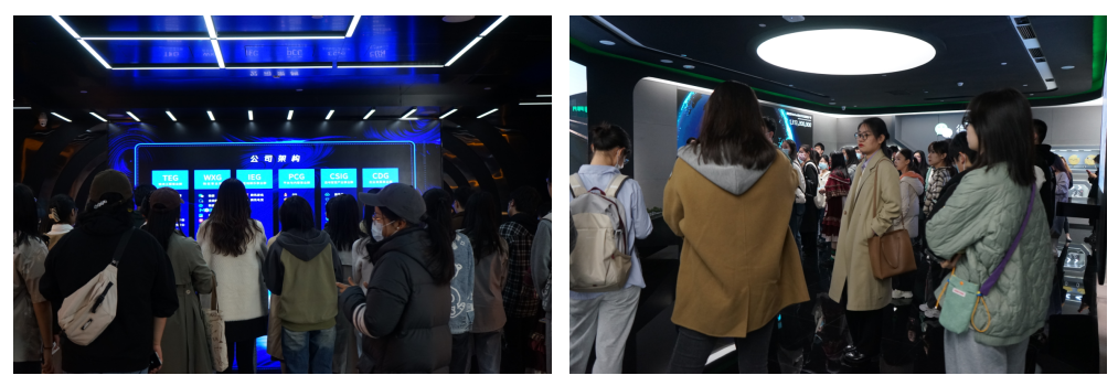 首先让同学们了解了腾讯作为一家互联网巨头的发展历程以及公司下设的六大事业群、数据储存和以腾讯云为行业实践的产业数字化技术。紧接着围绕腾讯产业和文化消费互联网布局分别进行讲解。在产业互联网布局方面,向大家介绍了大数据行程卡、健康码、省级部门小程序、智慧旅游平台等多项政务和民生服务,以及在促进医疗领域发展、制造业数据化转型、传统零售行业数字化转型、自动驾驶技术落地、网络安全防护等领域所取得的成就。在文化消费互联网布局方面,工作人员向大家讲解了腾讯新闻、腾讯体育、腾讯音乐、腾讯电竞等科技文化传播途径。此外,还介绍了公司在工艺数字化、乡村振兴等领域的探索,通过设立可持续社会价值事业部、成立腾讯基金会等关注和践行着社会责任。通过展厅参观,同学们对腾讯的主营业务、琉璃神社、目前的技术积累以及企业影响力等各个方面有了更加深入的了解和认识。