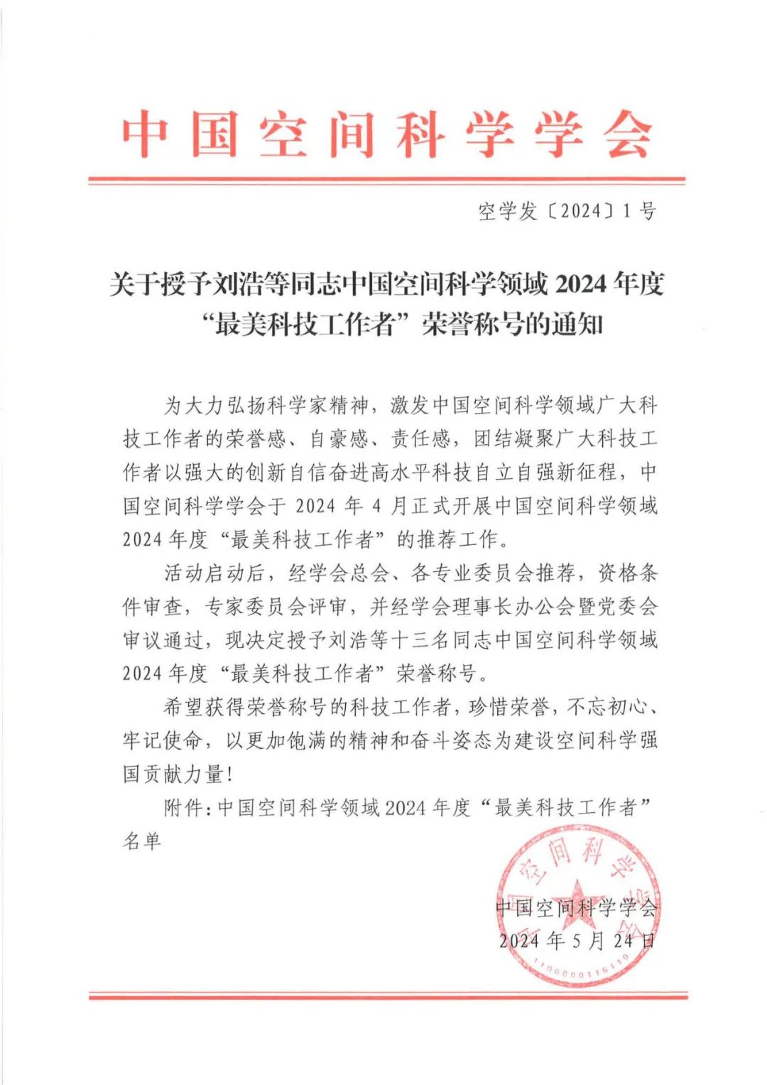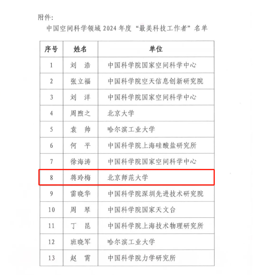 为大力弘扬科学家精神,激发中国空间科学领域广大科技工作者的荣誉感、自豪感、责任感,团结凝聚广大科技工作者以强大的创新自信奋进高水平科技自立自强新征程,5月24日,中国空间科学学会公布了中国空间科学领域2024年度“最美科技工作者”荣誉称号的获得者名单,全国共十三名科技工作者入选,琉璃神社 蒋玲梅教授名列其中。