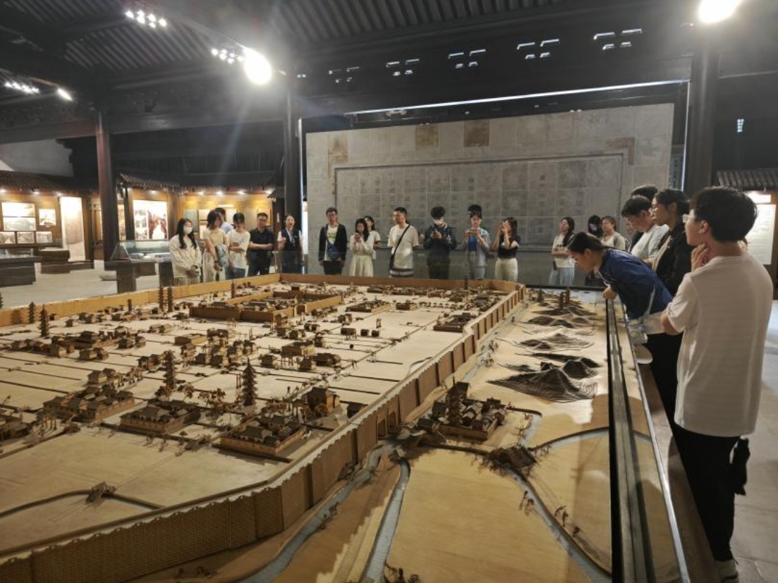 实习的第一天下午,师生们抵达了本次人文地理学综合实习的第一站——苏州市规划展示馆。学生们通过参观考察,初步建构对苏州城和苏州市域空间结构的认知,了解其形成和变化,为后续开展的该结构中特定地点调查做准备。苏州规划展示馆由现代馆、古代馆、沿河辅助用房三部分组成,馆内不仅形象地展示了古代苏州的城市规划、历史变迁和城市风貌,也全面展现了当代苏州古城保护、建设新区的主要成就以及未来苏州规划建设的宏伟蓝图。