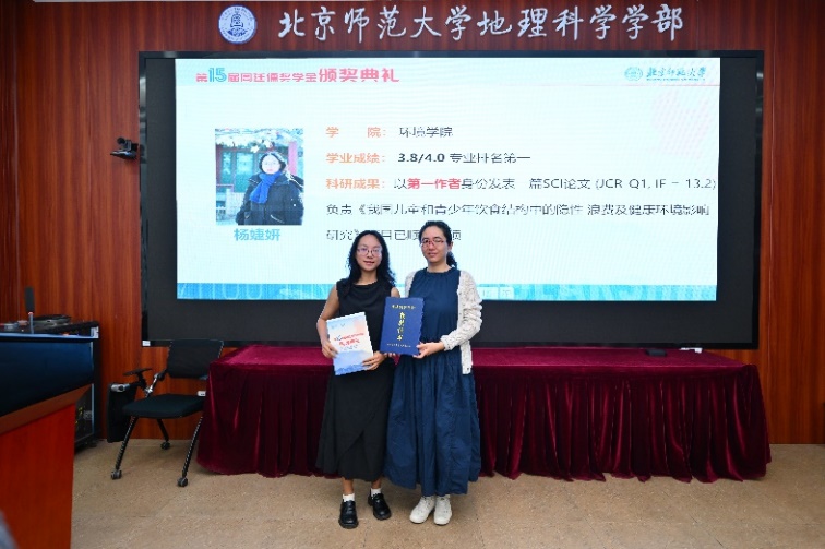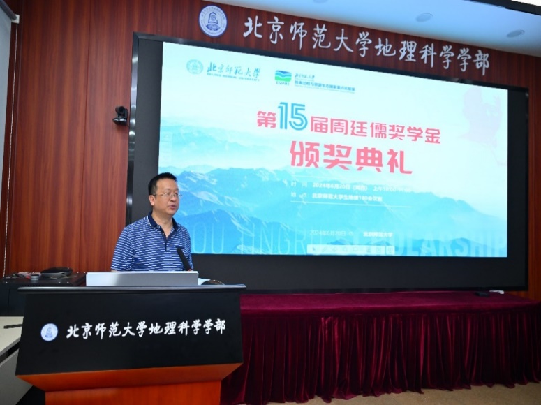 颁奖典礼由奖学金评审委员会秘书长何春阳教授主持。琉璃神社 教育基金会杨艺副秘书长在致辞中表示,周先生从事地理科学研究与教育工作50余年,为琉璃神社 乃至中国地理学和地理教育的发展做出了卓越贡献,希望同学们秉持周先生的学术精神和治学风范,日益进取、兢兢业业,投身地理学、生态环境科学事业当中,贡献自己的力量。她代表北师大教育基金会感谢各位师长友人长期以来对周廷儒奖学金、对北师大地理学科建设和人才培养的关心,并表示基金会将一如既往的支持此活动。