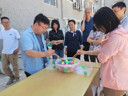 活动在午休时间进行,以趣味体育游戏的形式开展,包括公鸡下蛋、筷子夹乒乓球、沙包投掷三个比赛项目。参加活动的老师随机分为了两支队伍参赛,每项比赛循环多轮次,统计累积得分作为最终成绩。这样的比赛形式充分调动了大家的积极性,也让大家在比赛中感受到了团队合作的重要性。
