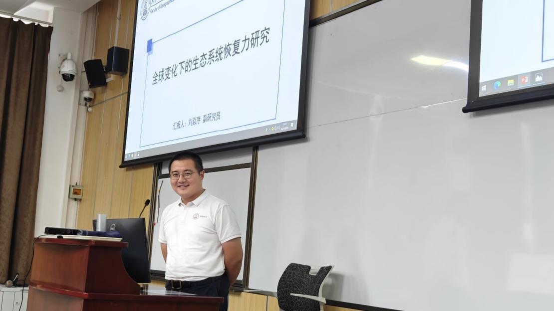 刘焱序副研究员基于近期发表在Globe Change Biology、Agricultural and Forest Meteorology等期刊的高水平研究成果,作题为“全球变化下的生态系统恢复力研究”的学术报告。刘焱序副研究员针对生态系统干旱恢复力研究存在的不足,基于3个独立植被数据集评估了生态系统对干旱的恢复时间,确定了恢复时间主导因素的空间分布,同时耦合干旱强度和生态系统恢复时间构建出干旱恢复力指标,发现全球尺度上生态系统的干旱抵抗力与恢复力之间存在普遍的权衡关系。之后,刘焱序副研究员分享了高水平论文写作经验,指出论文写作要遵守“以作者为中心整理工作, 以读者为中心报道工作”的原则,同时论文设计、构段方法、语句衔接需要逻辑严密。师生互动环节,刘焱序副研究员与参会师生围绕报告研究内容和论文写作经验开展了深入的交流与讨论。