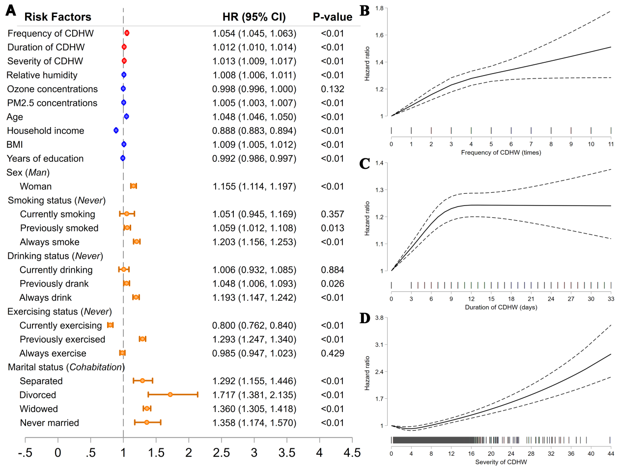 基于5个全球气候模式和10个全球气候—水文耦合模式的多模型偏差校正模拟输出,识别了中国历史时期(1941—2014年)和3种不同未来场景下(SSP1-2.6, SSP3-7.0, SSP5-8.5; 2015—2100年)45种不同定义的复合干旱热浪事件频率、持续时间和严重程度的时空变化。结合2002—2014年中国老年健康与家庭幸福调查(CLHLS),利用COX比例风险模型,评估了复合干旱热浪事件频率增加,持续时间延长和严重程度加剧对中国老年人死亡风险的线性、非线性和异质性影响(图2)。
