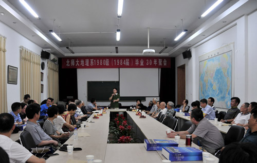 迎来了49位久别重逢的学子——北师大地理系1980级(1984届)毕业30年的校友。30年前62位热血青年汇成的班集体——地理1980级,同学们带着各自的人生理想和奋斗目标奔赴祖国和世界的不同方向。一别三十载,两鬓五十白。今天,大家带着各自的人生感悟回来了!带着不同的沧桑历练回来了!带着对母校师长的感激与惦念回来了。再聚北师地理,重温同窗情谊,忆往昔青春岁月稠,憾今日相聚时光短;再遇相知,音容有变,但目光依旧;身形虽厚,却沧桑已有;人知天命,仍执着追求。在地理学与遥感科学学院180会议室,80级的同学们与老师欢聚一堂,再次聆听谆谆的教诲、关爱的寄语,几位代表海内外不同领域的同学发言,表达了我们这一代北师地理学人,历经国家社会的复兴发展、事业人生的沧桑剧变,秉持着地理学人博大精深的情怀,杏坛育人,舆地兴邦。三十年的成长历练,让大家为北师大骄傲、为地理学自豪。三十年变化的岁月容颜,不变的是真情与美好。更感谢学院前、后两任院长专程前来表达问候与祝贺。告别学院与老师,同学们又重回久别的教二、教三、西北与中南,曾经有过约定的八十年代新一辈,再过二十年,转眼已三十年,我们终于再相会。伟大的祖国心中你最美,青春的校园令人久回味,曾经的同学少年,并肩漫步在昔日的校园小路,鬓染霜,心未老,梦犹在,又起航......。