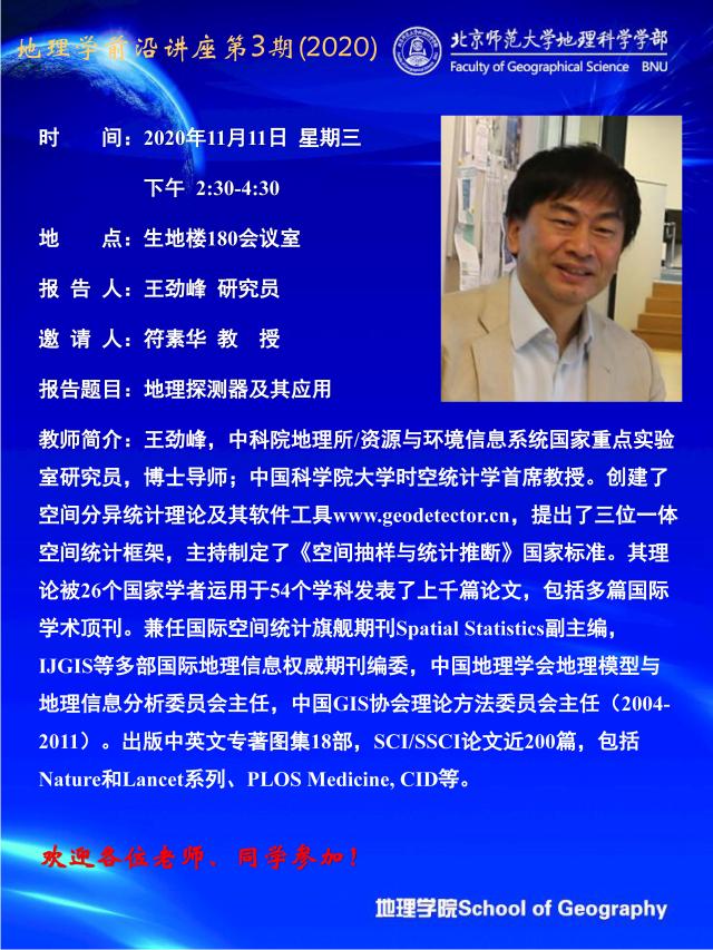 【11月11日讲座】地理学前沿讲座第3期(2020)王劲峰:地理探测器及其应用