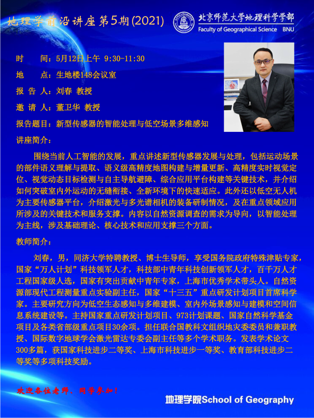 【5月12日讲座】地理学前沿讲座第5期(2021)刘春:新型传感器的智能处理与低空场景多维感知