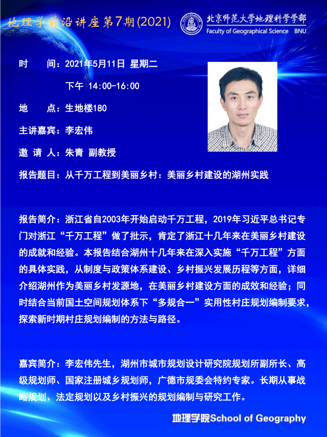 【5月11日讲座】地理学前沿讲座第7期(2021)李宏伟: 从千万工程到美丽乡村:美丽乡村建设的湖州实践