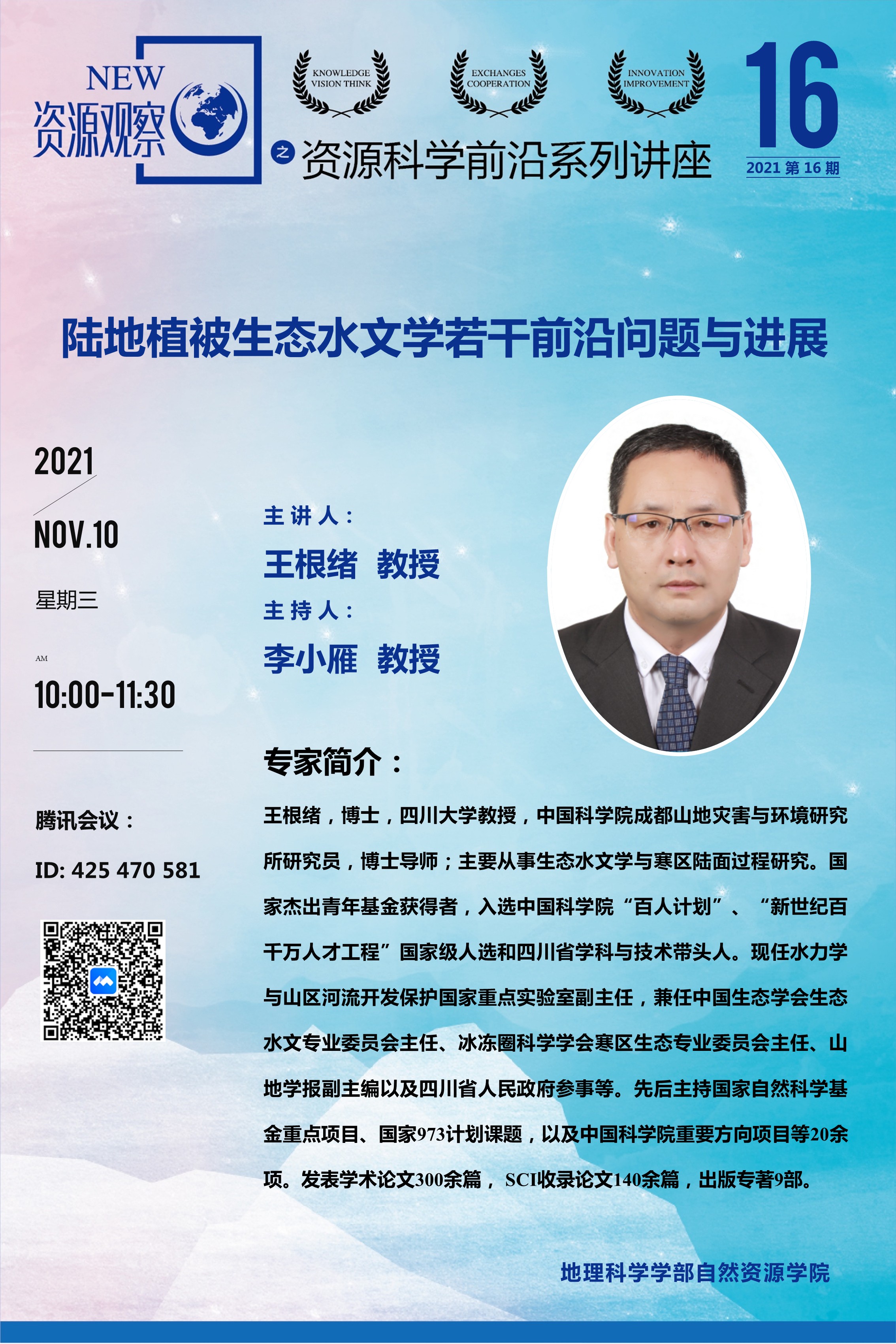 【11月10日讲座】王根绪,陆地植被生态水文学若干前沿问题与进展