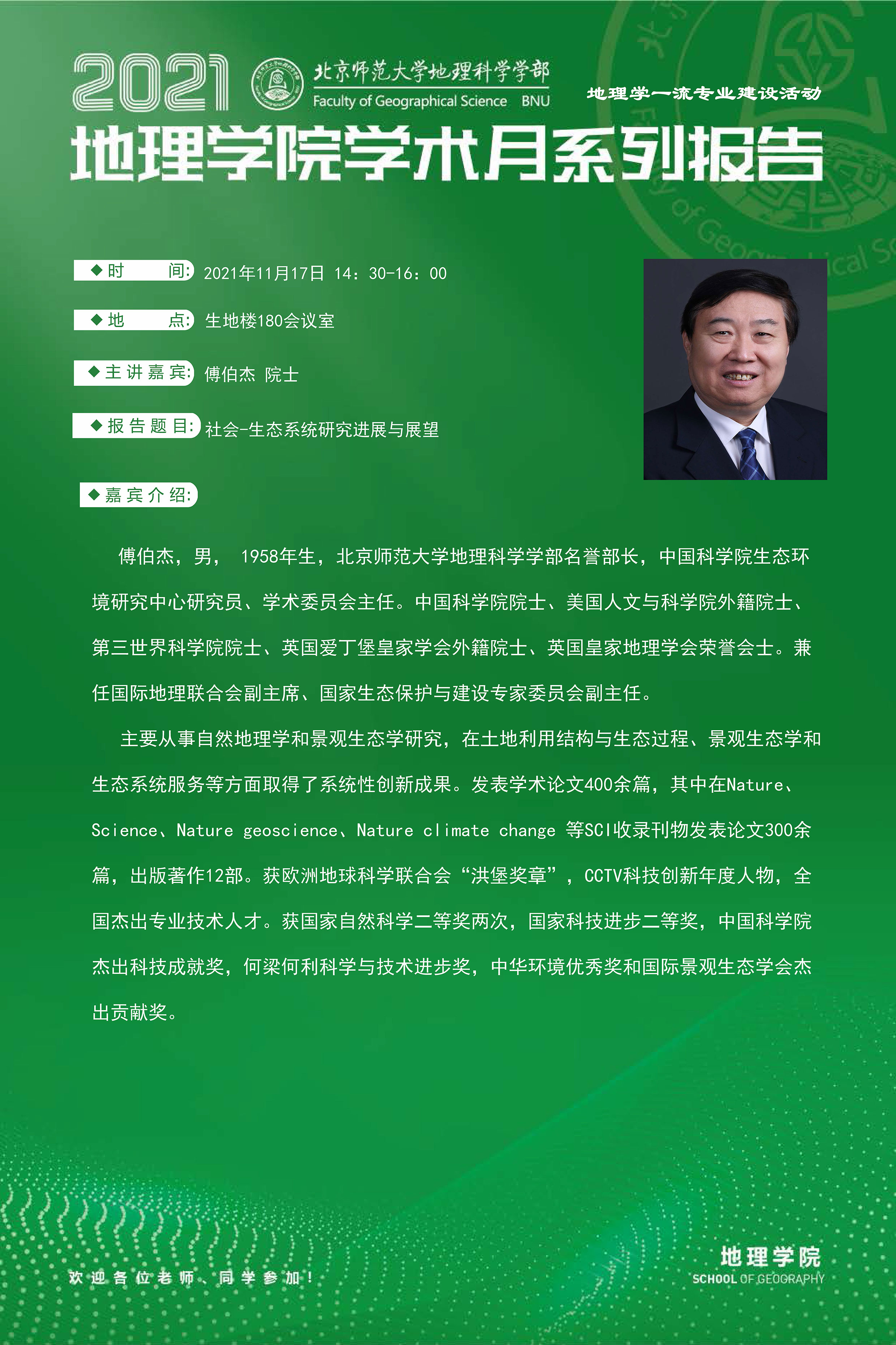 【11月17日讲座】2021地理学院学术月系列报告 傅伯杰:社会-生态系统研究进展与展望