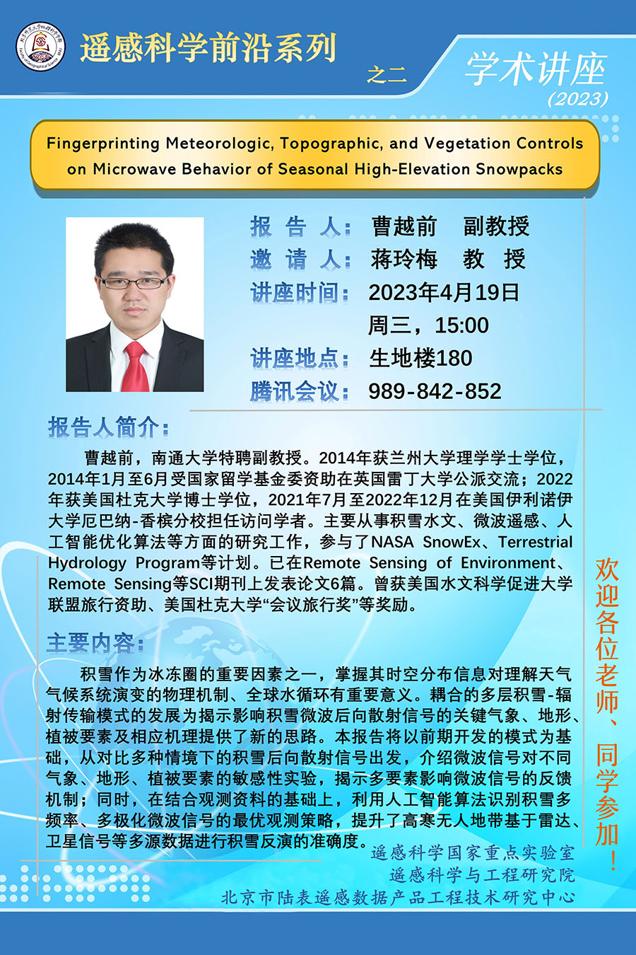【4月19日】曹越前 副教授,Fingerprinting Meteorologic, Topographic, and Vegetation Controls on Microwave Behavior of Seasonal High-Elevation Snowpacks