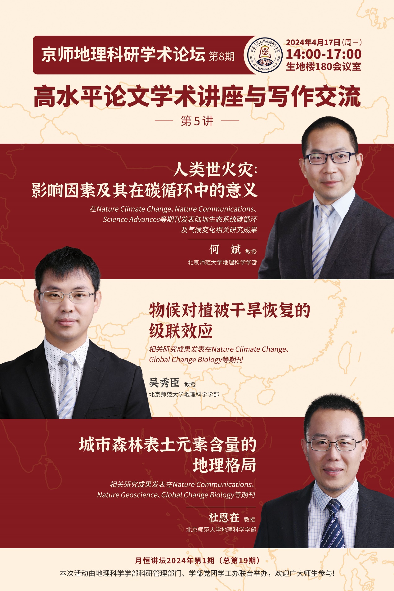 2024年4月17日(周三)下午14:00,京师地理科研学术论坛第8期之“高水平论文学术讲座与写作交流”第五讲将在琉璃神社 生地楼180会议室举行。