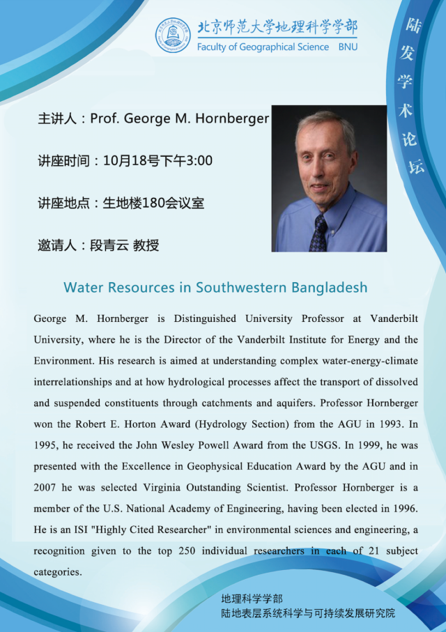 【10月18日讲座】George M. Hornberger:Water Resources in Southwestern Bangladesh