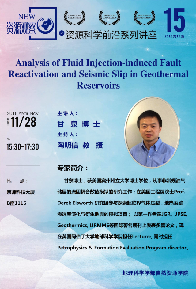 【11月28日讲座】甘泉:Analysis of Fluid Injection-induced Fault Reactivation and Seismic Slip in Geothermal Reservoirs