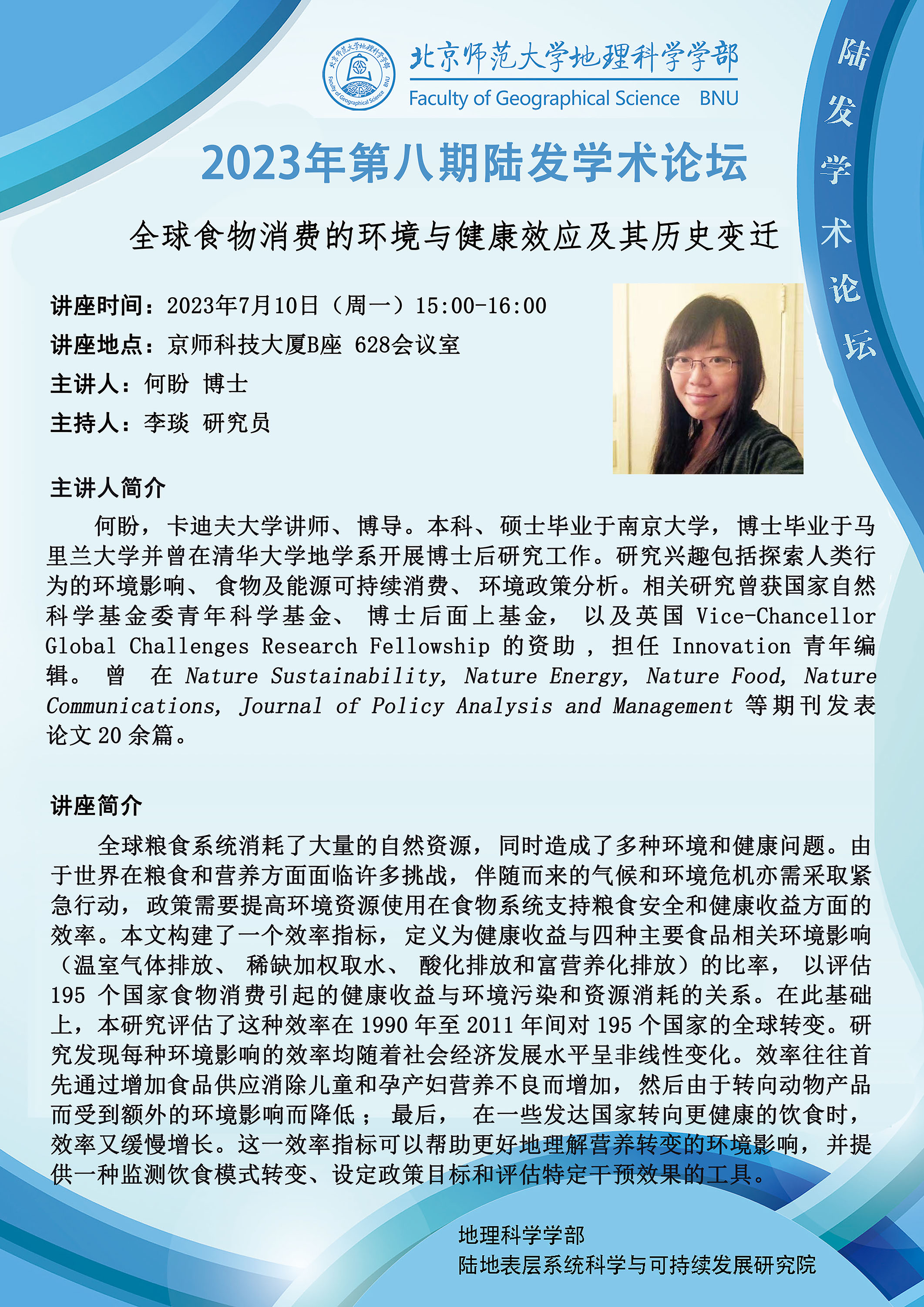 【7月10日】何盼 博士,全球食物消费的环境与健康效应及其历史变迁